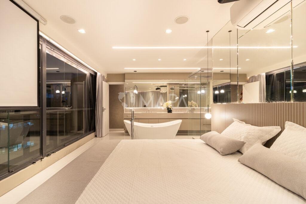 - Divisórias Sutis : Embora o banheiro fique aberto para o quarto, são usadas divisórias sutis, como vidro fosco ou cortinas, para manter uma certa privacidade.